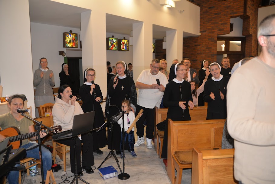 Po błogosławieństwie wszyscy kierowali się ponownie do Szkoły Podstawowej na obiad. Przy drzwiach wyjściowych Siostry rozdawały upominki dla każdej rodziny. Po obiedzie rodziny zostały podzielone na dwie grupy i pojechały z Siostrami do domu przy ul. Warszawskiej 13, by nawiedzić kaplice Domu oraz pokój bł. Franciszki Siedliskiej. Historie domu oraz osobę bł. Franciszki Siedliskiej przedstawiła rodzinom s. Elena Wróbel. Odwiedziny pokoju Matki Założycielki to nie był jeszcze ostatni punkt obchodów jubileuszu. W godzinach wieczornych spotkaliśmy się całymi rodzinami w kaplicy Domu Prowincjalnego przy ul. Nazaretańskiej 1 na Adoracji Najświętszego Sakramentu i uwielbieniu Boga za 25 lat istnienia SNR. Uwielbienie to bardzo ciekawie poprowadził o. Robert Więcek SJ. Rodziny aktywnie włączały się w modlitwę, o której piękną oprawę muzyczną i śpiew zadbała Leśniowska wspólnota SNR, czyli rodziny Radosz i Wyrębak wraz s. Martą Domagała. Uwielbienie zakończyło się błogosławieństwem indywidualnym rodzin. Po nim długo jeszcze nie mogliśmy się rozstać, a hol Domu Prowincjalnego pozostawał pełen gwaru radosnych i wzruszających rozmów rodzin z siostrami. Niedzielne przedpołudnie było swego rodzaju przedłużeniem świętowania, gdyż wiele rodzin skorzystało z noclegów w naszych domach. Wspólna modlitwa, Eucharystia i rozmowy przy przedpołudniowej kawie były dalszym dzieleniem się wzruszeniami z tego spotkania.