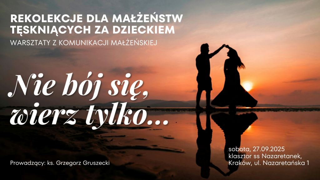 Serdecznie zapraszamy na Dzień Skupienia dla Małżeństw Niepłodnych pt. “Nie bój się, wierz tylko….” Trzema głównymi punktami dnia skupienia będą: warsztaty z komunikacji małżeńskiej, konferencje rekolekcyjne oraz Msza św. o dar potomstwa z uwielbieniem. Warsztaty z komunikacji poprowadzi Anna Orkisz, pedagog, terapeuta, instruktor Modelu Creightona. Konferencje wygłosi ks. Grzegorz Gruszecki, proboszcz w parafii Narodzenia NMP w Żywcu, papieski misjonarz miłosierdzia. Będziemy też zawierzać nasze tęsknoty w czasie Mszy św. o dar potomstwa – intencje można składać przez nasz formularz. A na koniec będziemy mogli uwielbić Pana Boga w pięknym nabożeństwie prowadzonym przez Saletyńską Wspólnotę Nowej Ewangelizacji.